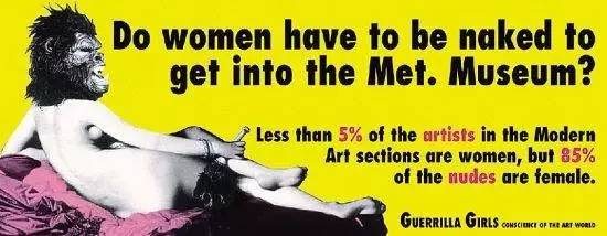在上世纪80年代的美国,一群由专业艺术家组成的艺术群体开始活跃起来,她们称自己是“游击队女孩”。这些艺术家头戴大猩猩面具出现在公众场合,用已故女艺术家的姓名作为自己的代号。她们通过恶搞世界名画中的女性裸体画,控诉艺术界内的性别歧视问题并为女性发声。