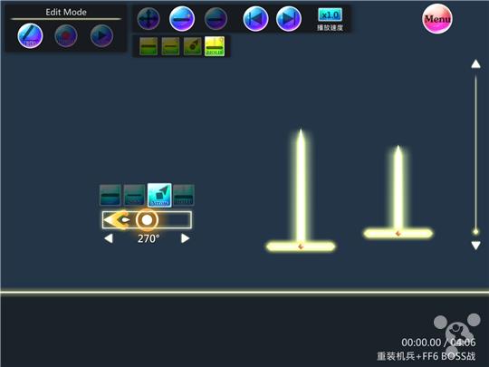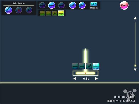 不得不说编辑模式里的功能真的很齐全,在工作区域点击就可以放置 Note,Note 可以随意拖动位置,可以设置滑动、长按、双击还有滑动的方向。长按还可以设定按住的时间。另外在编辑菜单的工具选单里,还可以设定 BMP(歌曲速度)等具体的参数。
