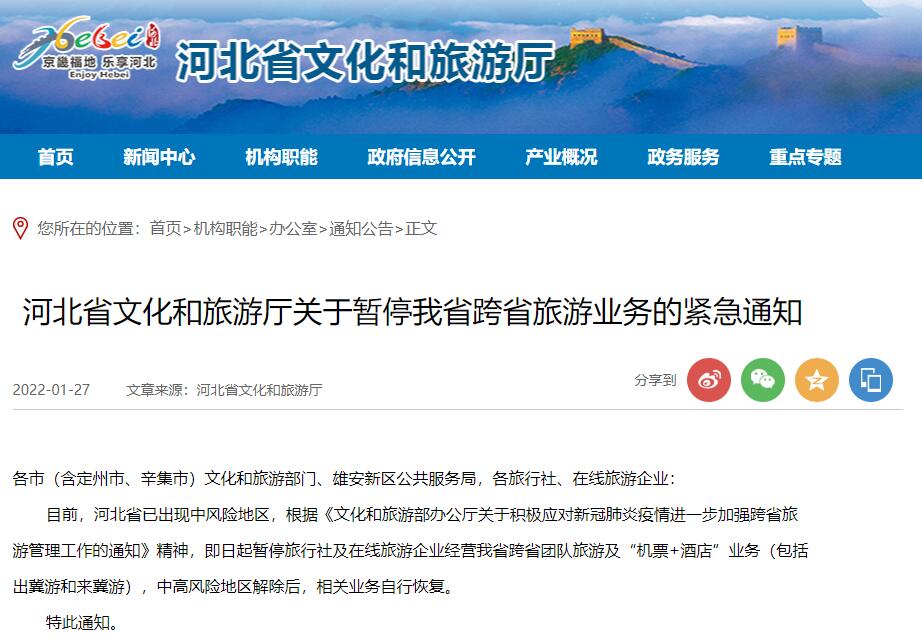中国网1月27日讯 据河北省文化和旅游厅网站今日消息,目前,河北省已出现中风险地区,根据《文化和旅游部办公厅关于积极应对新冠肺炎疫情进一步加强跨省旅游管理工作的通知》精神,即日起暂停旅行社及在线旅游企业经营我省跨省团队旅游及“机票+酒店”业务(包括出冀游和来冀游),中高风险地区解除后,相关业务自行恢复。