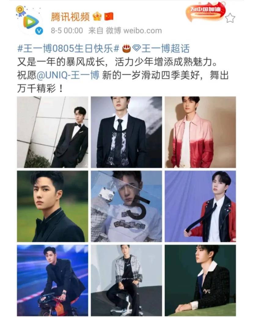 而就在生日这天,送祝福的不仅仅是粉丝,更有很多知名媒体,腾讯视频等多家媒体平台纷纷卡点发文,祝福王一博生日快乐。