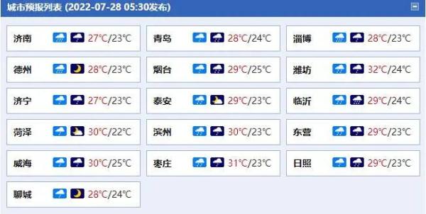 最高气温:鲁中山区和半岛地区28℃左右,其他地区30℃左右。