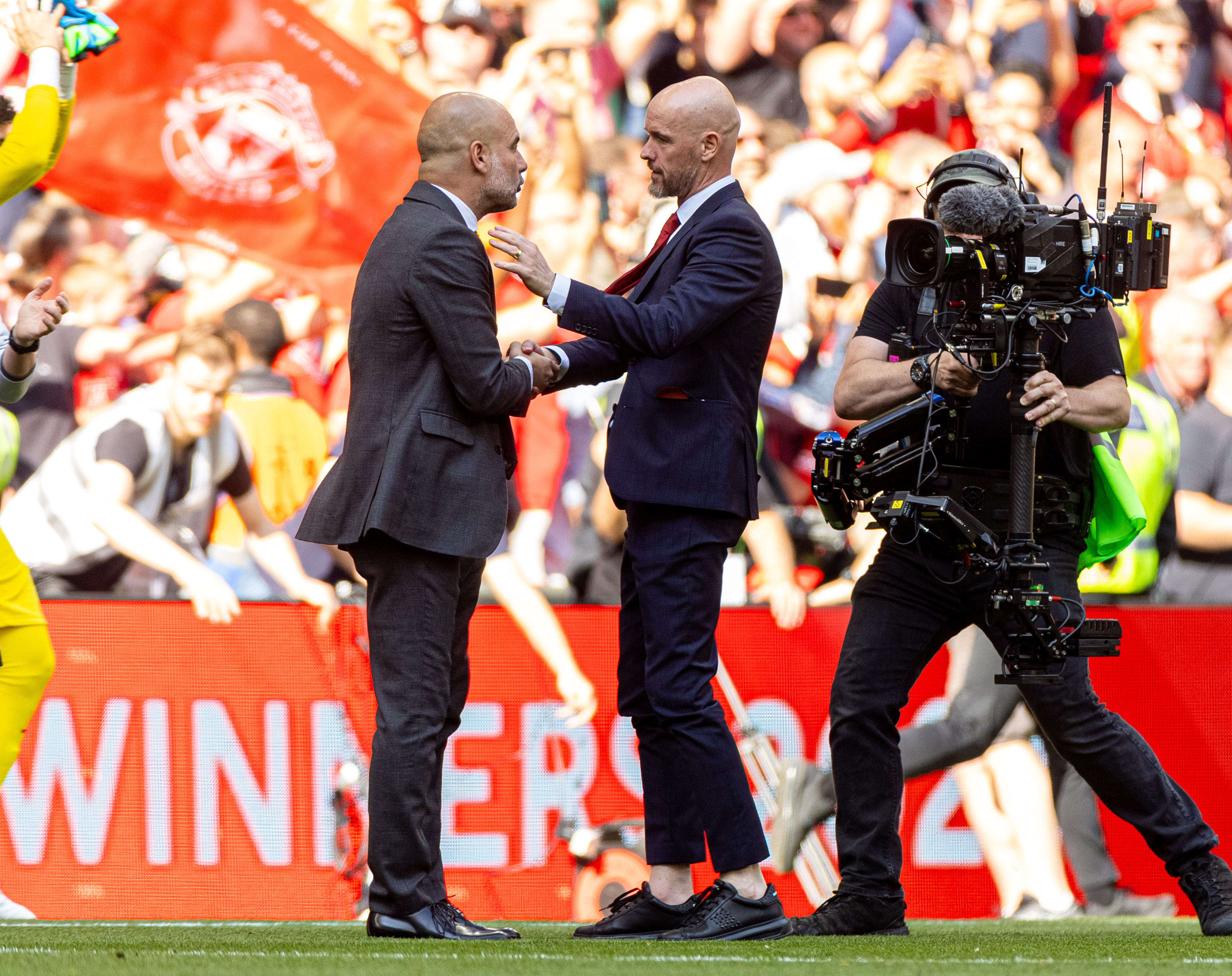 5月25日,曼彻斯特城队主教练瓜迪奥拉(左)与曼彻斯特联队主教练滕哈格在比赛后相互致意。 新华社发