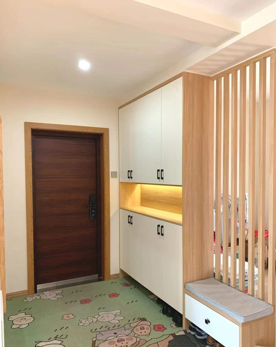入户门口铺了一张动物图案的地垫,显得活泼有趣,让人进门就能感觉到放松,进门左手边定制了一个鞋柜,柜子采用分层设计,集储物、展示和常用鞋位于一体,中间镂空处安装了灯带,避免晚上摸黑,柜子旁边连接着换鞋凳,方便坐着换鞋,后面设计了木格栅,既承担着靠背功能,又隔断了两个空间,起到了保护私密的作用,还不影响采光,整体设计美观实用。