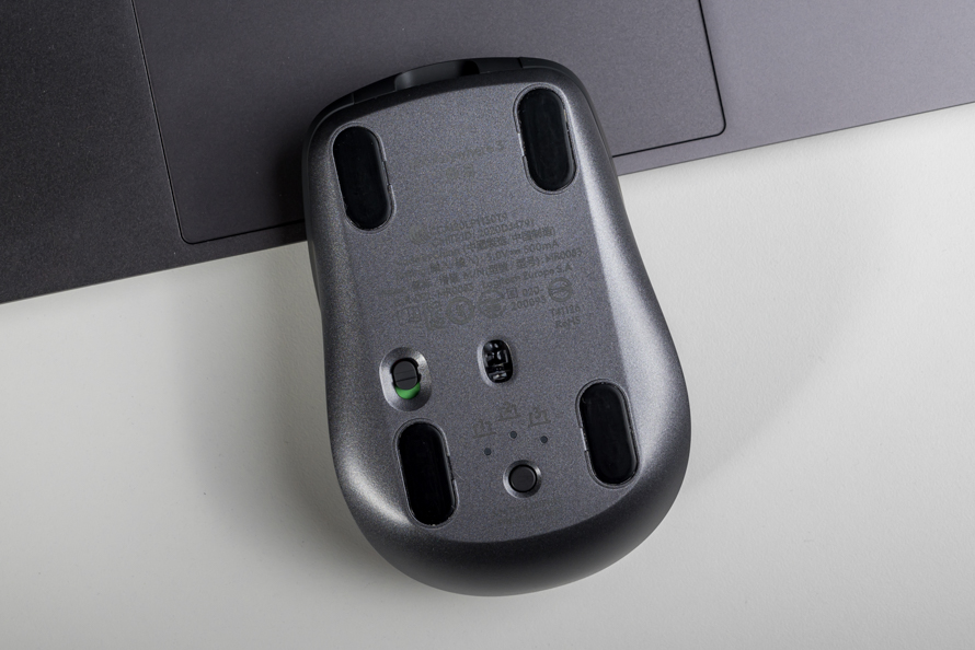 罗技MX Anywhere 3机身左侧设计了两颗按键,手感还算不错,按键很结实不会轻易晃动,大厂做工品控还是值得信赖的。鼠标的底部是标准的是四脚贴设计,下面是三设备的切换按键,是的,罗技MX Anywhere 3最多可同时配对3台设备。此外罗技MX Anywhere 3采用了Darkfield传感器,这是一颗妥妥的“黑科技”传感器,它让鼠标可以在玻璃、沙发、餐桌甚至是床面上都能够正常的工作。
