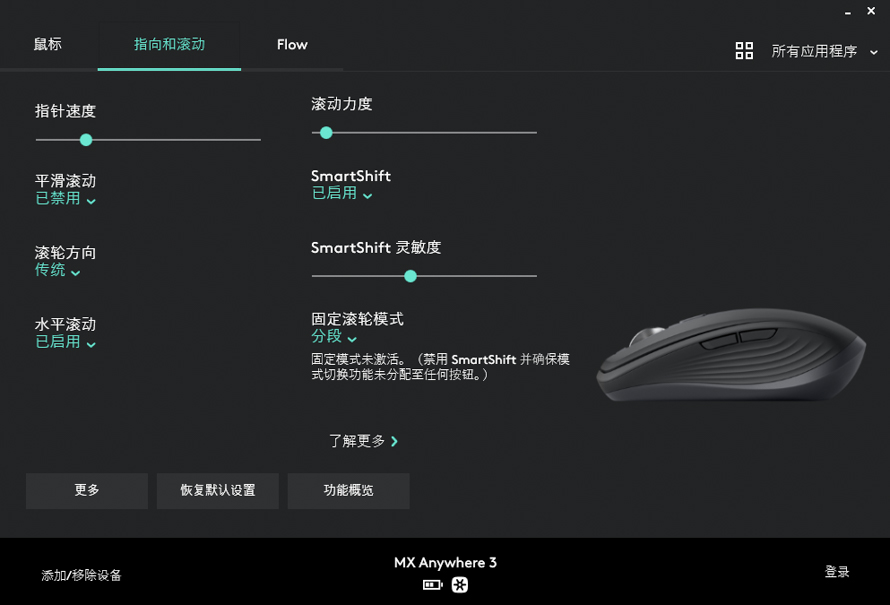 而且罗技MX Anywhere 3的滚轮段落阻尼感也不是一成不变的,下载罗技Logitech Options软件,便可以设置滚动力度也就是阻尼大小,还有SmartShift灵敏度,大家可以根据自己的喜好设置合适的阻尼大小。我个人就比较喜欢滚动力度小一些,因为这样手指用的力也会更小一些。