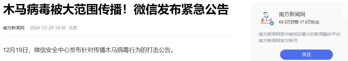 信息来源:南方新闻网 2024-12-20 木马病毒被大范围传播!微信发布紧急公告