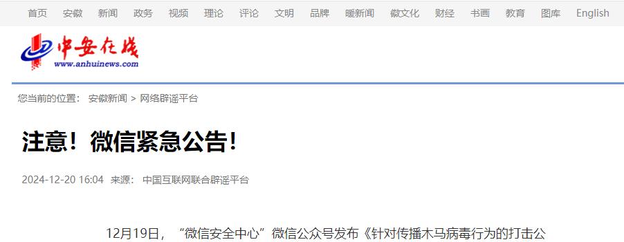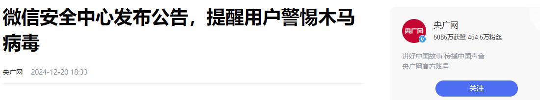 信息来源:央广网 2024-12-20 微信安全中心发布公告,提醒用户警惕木马病毒