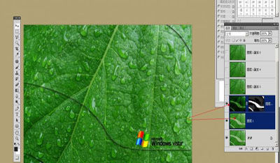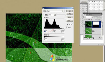 第一、复制一下原图的图层,给它添加图层蒙版,并且调整色阶,这样做的意思是为了把图中灰色的水印背景色调整为比较接近叶子的原色。这样的话就减少了水印修复区域。如下图所示