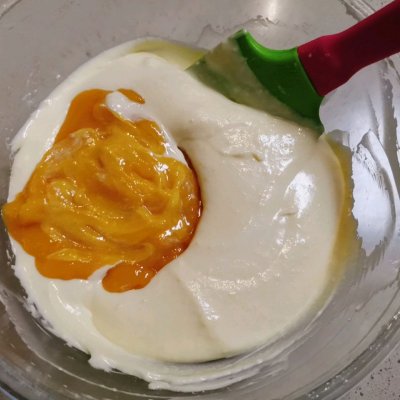 7、慢慢倒入蛋黄糊中,边倒边搅拌。