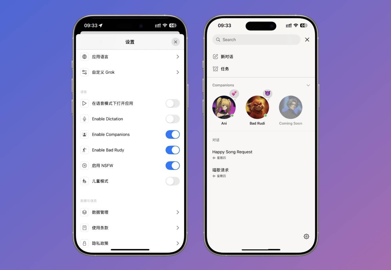 我也立刻更新 Grok 尝试了一下,他们都会说中文,而且 Bad Rudi 的嘴是真的毒,我都没说几个字,他就脏话连篇了,Ani 也是真的很少女、很可爱。