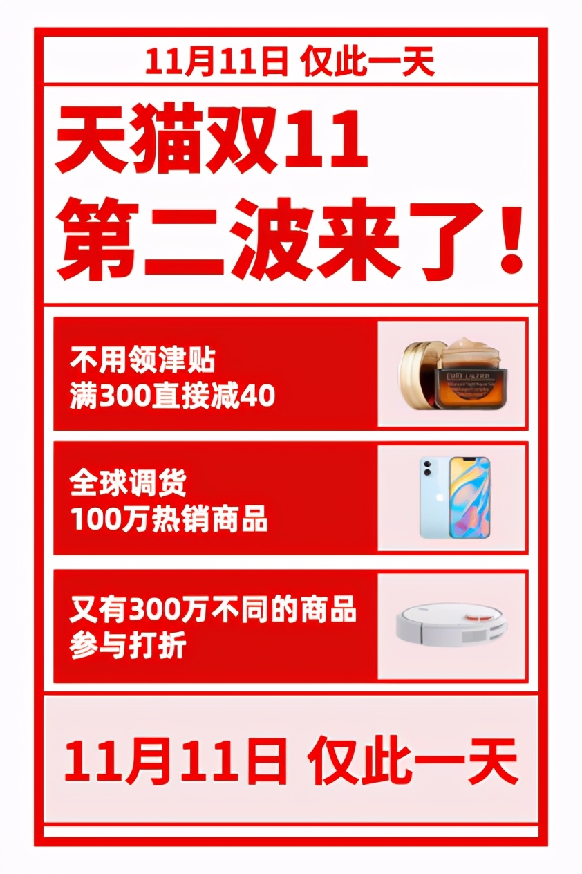 据天猫双11组委会透露,11月11日当天,超过1600万商品将参与双11折扣,优惠商品比第一波更多,给消费者带来“仅此一天”的优惠体验。