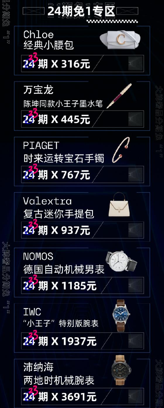 小编从天猫双11的大牌奢品分期免“1”专区里,看到了:在天猫独家发布限量新款的法国著名时装及奢侈品品牌蔻依,新品链条包12期免1后每月仅667元;一款签字笔首小时超过线下3个月销量的万宝龙,紧急调货陈坤同款小王子墨水笔再上架,24期免1月供445元;上演连续补货三次戏码的万国,两款网红腕表葡计和飞行员系列第四次补货,并分别赠送IWC定制黑色鳄鱼皮表带和飞行员夹克……