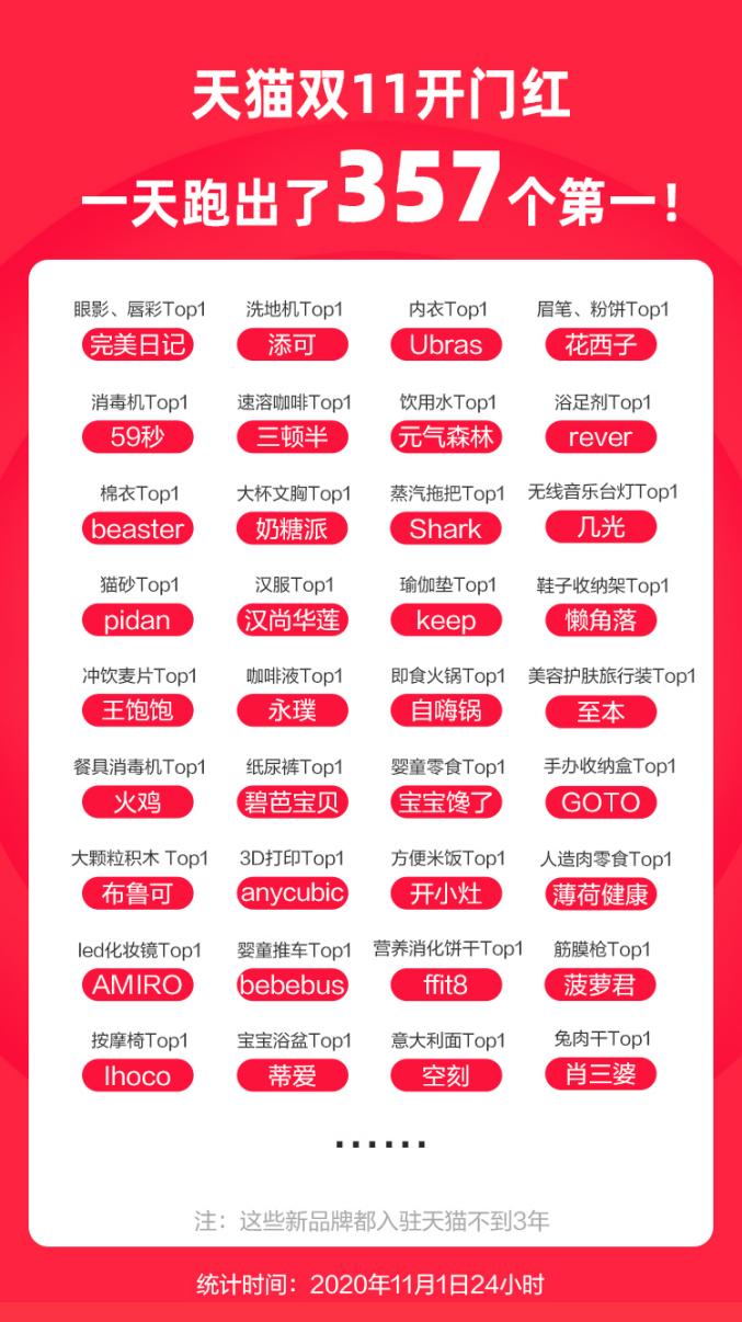 数字显示,天猫双11第一波售卖期,已有357个新品牌成交额登顶细分类目Top1,首战告捷!其中,完美日记、花西子、Ubras、蕉内、添可极速破亿,迎来开门红。更多新品牌也卯足了劲,将在11日11上架更多新品。