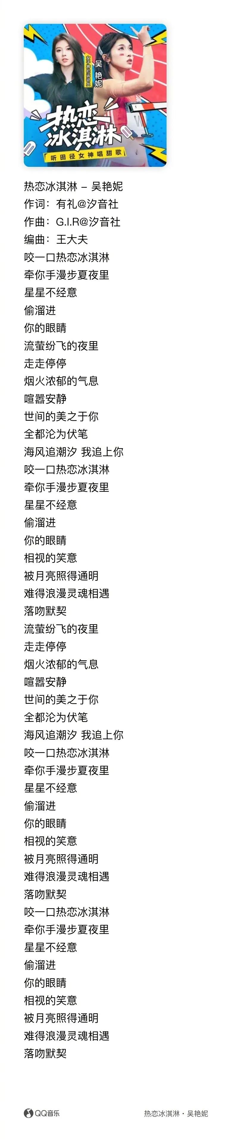 根据公开信息显示,《热恋冰淇淋》于2021年7月29日发行,原唱歌手为yihuik苡慧,吴艳妮此番应该为翻唱。专辑简介中写道:她是赛道上的跨栏女王,也是麦克风前的甜嗓担当。中国国家田径队队员、女子60米栏全国纪录保持者吴艳妮,首支单曲《热恋冰淇淋》甜美上线!撕掉标签,活成自信光芒的样子。