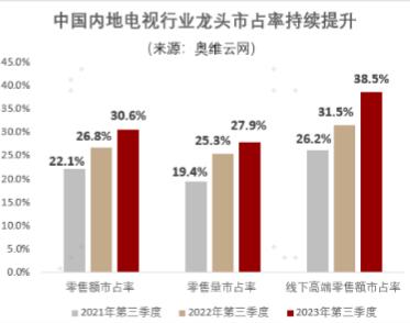 奥维云网第三季度数据显示,中国境内海信系电视零售额是市占率为30.6%,零售量市占率为27.9%,线下高端零售额市占率为38.5%,三项数据均呈现明显的上升趋势。