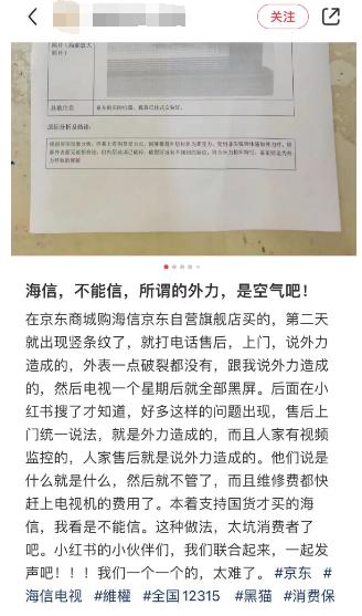在小红书上,有投诉者不满海信售后提出“手指碰到也会导致内屏破裂”的说法。也有投诉者抱怨新买的电视不久就出问题,维修费快赶上电视机的价格。