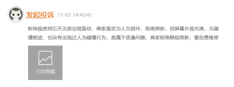 在黑猫投诉平台上,有投诉者指出屏幕外观是光滑、无碰撞痕迹的,售后却鉴定为人为损坏。还有投诉者对于海信售后无法修好电视感到不解。