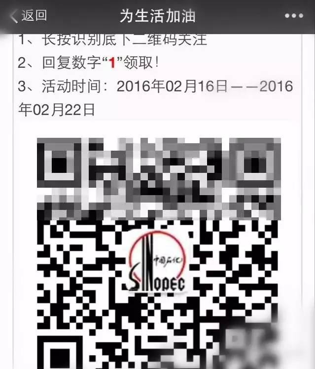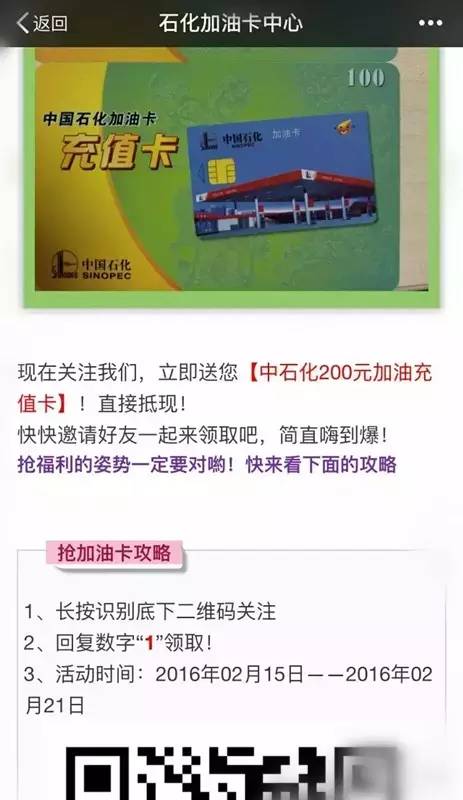 近日,一个名为“为生活加油”的微信公众号发布了一条“2016中国石化‘油中感谢’,大家一起来卡油!”的活动刷爆微信朋友圈,声称可免费领取加油卡,让有车一族大为振奋,纷纷参与转发。据该公众号内容显示,“2016年2月15日—2016年2月21日关注该微信号并回复“1”即可获得面值200元的中石化加油充值卡”。
