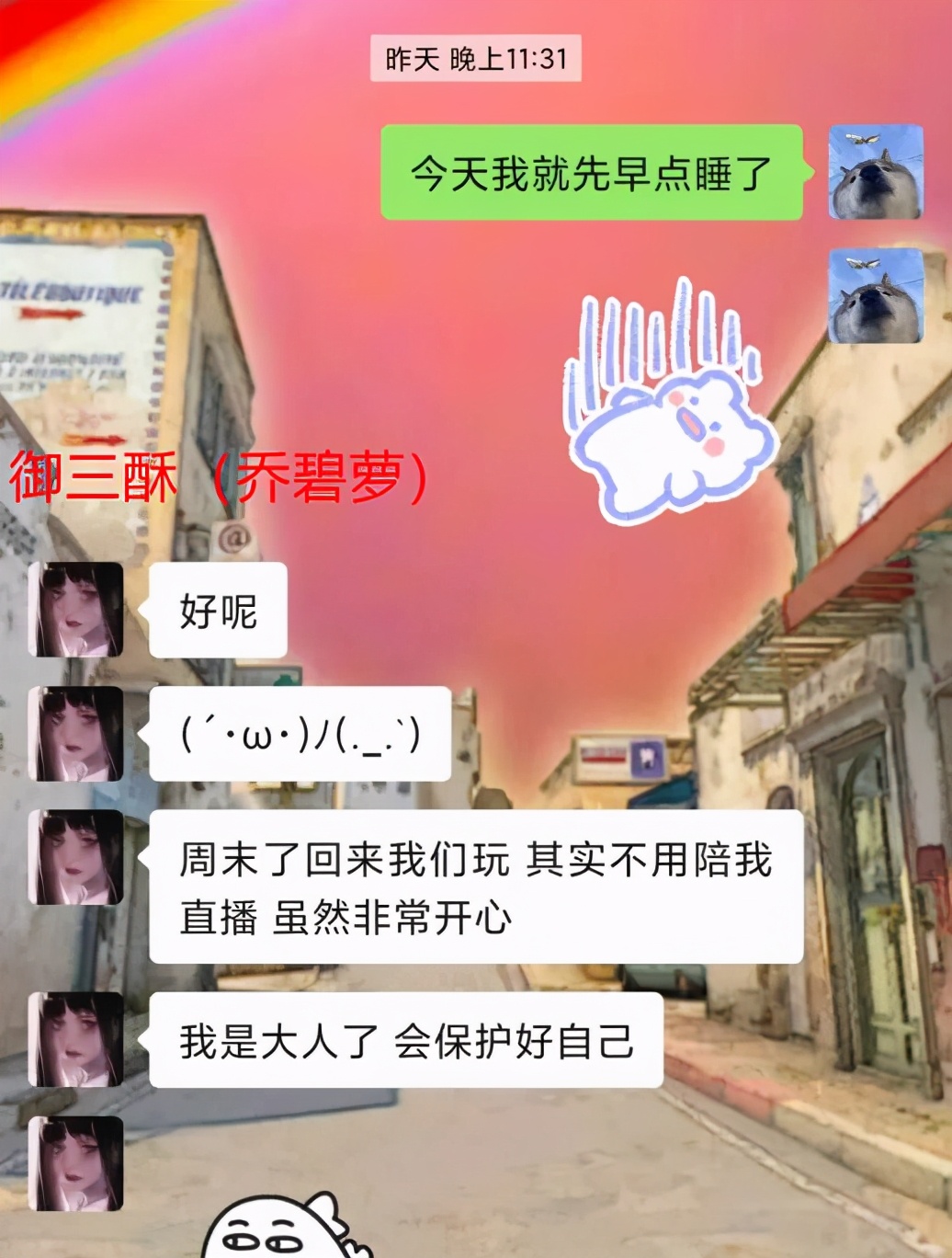 由于给御三酥刷了礼物,两个人就顺理成章地加上了彼此的联系方式,御三酥也是很会聊天,每天卖萌、撒娇信手拈来,导致白衣日渐深陷。