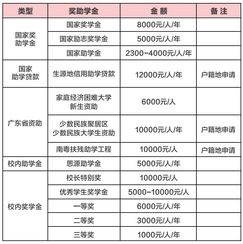 学校奖助学金各类齐全,目前设有国家规定的国家奖学金、国家励志奖学金、国家助学金、广东省家庭经济困难大学新生资助等。学院还设有思源助学金、凤凰奖学金等校内奖助政策。另外,针对不同类型学生,广东生还设有广东省少数民族聚居区少数民族大学生资助、南粤扶残助学工程等资助政策。