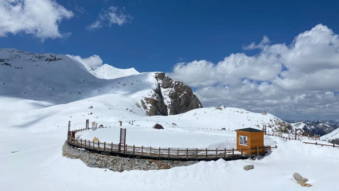 或许有人不敢相信,到了五月,达古冰川依旧白雪皑皑,四处都是银装素裹。