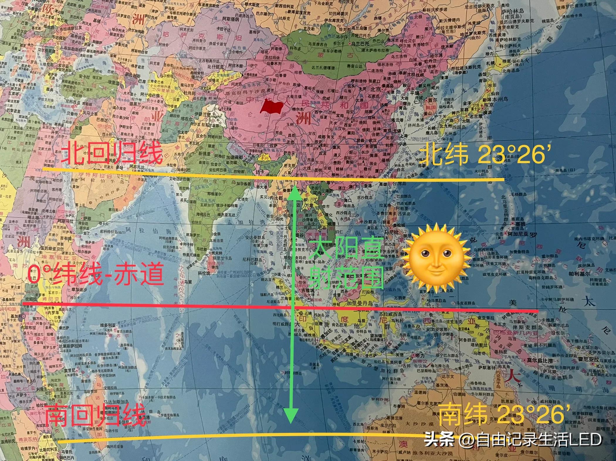 黄赤交角使地球上的太阳直射点在北纬23°26′到南纬23°26′之间来回移动,