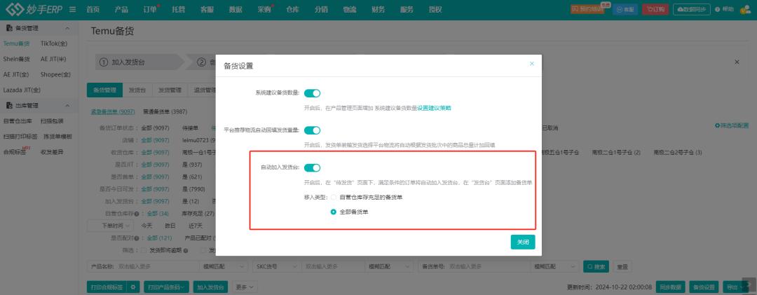 妙手帮您轻松搞定!卖家朋友在TEMU备货-【备货设置】中开启自动加入发货台后,当店铺出单时,系统自动将符合条件的备货单加入发货台,无需卖家手动接单,减少人力、时间成本。