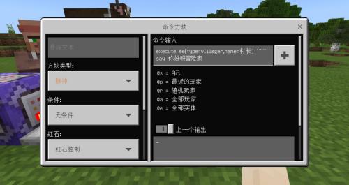 然后在命令方块的任意一侧放一个红石比较器和红石粉,再连接一个命令方块,打开命令方块并输入“execute @e[type=villager,name=村长] ~~~ say 你好呀冒险家”其他设置保持默认即可。