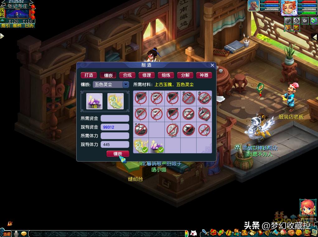 在打铁炉或缝纫台处镶嵌“五色灵尘”后,可提升“上古玉魄”的灵尘等级,从而强化其附加属性。