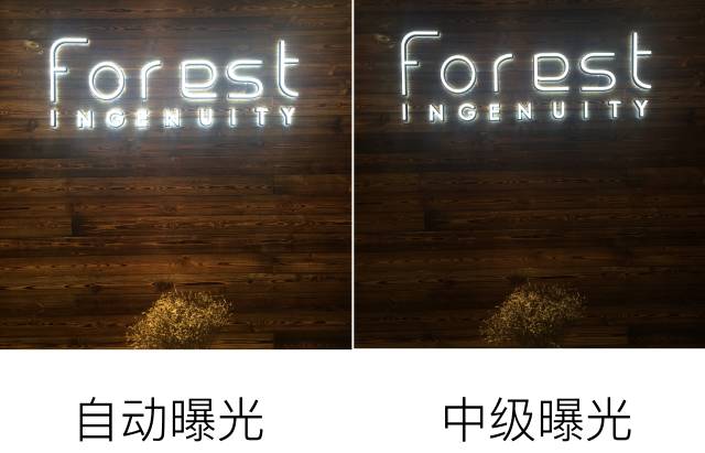 如图所示,原片未处理。这个场景里的画面整体偏暗,使用自动曝光会把照片变亮(左图),灯光字体部分过曝且有粗糙毛边。右图使用中级曝光的技巧,即点击灯光字体的位置,照片整体变暗,字体曝光正常(右图),暗部也得以保留质感。