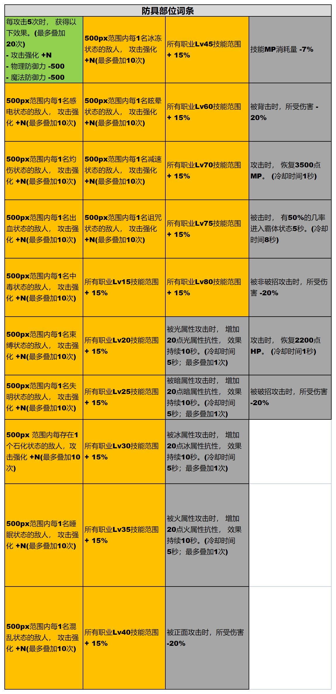 首先,各个系列自定义装备的专属词条如上图所示,已经给大家整理出来了,适用面较大,条件较为轻松的词条为绿色标注,适用面较低,需要满足一定条件触发的词条则为黄色标注部分,而灰色标注部分除部分特殊需求,此类词条作用较小。