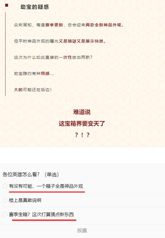 后续官方也证实了,确实会有“大动作”!而且隐隐地透露出了,这次将会是“宝箱机制”的一次改革!甚至有玩家猜测,会不会有一个“新箱子”,整个宝箱里都是神品外观武器皮肤!或者赛季宝箱要搞点“新玩意”了,兴许到时候人手一把神品武器?