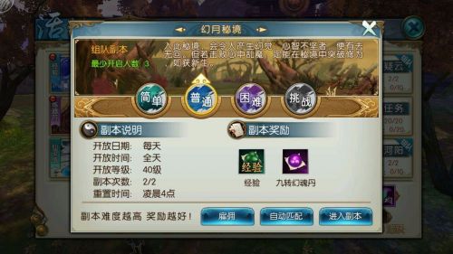 经验重要来源之一,不过难易度上嘛,小编唯一一次副本超时就是打普通幻月。奖励上来说还不错,简单模式下完成度很高。普通模式打起来有点费劲。建议玩家即便到了40级,没有一定的装备累积还是不要去碰普通的,老老实实打简单更有效率。