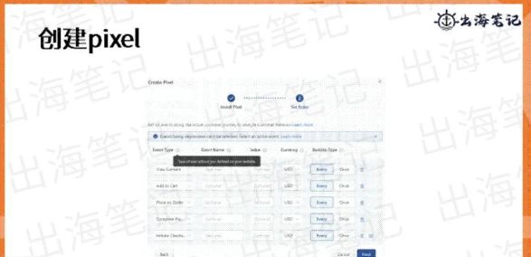 当然你也可以给他填一个名字, 然后创建pixel。这里面你可以细分每一步,view content, add to cart, place order,complete payment每一个pixel会让你设置一个指标给它,告诉这个系统怎么样才算是这个event去触发了。