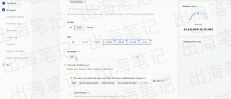 如果说你的很精准, 比如说我是投打游戏的人,那我就选择follow喜欢game,和technology这些人,然后右边这里面可以看到你的一个受众群体,然后选择你的设备。