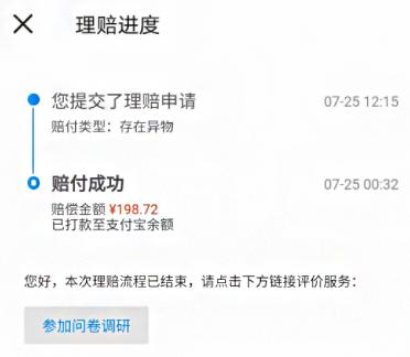 我们有位同事点的外卖有异物,立即向平台申请理赔,当天赔偿金就到账了。可见,理赔还是很便捷的。