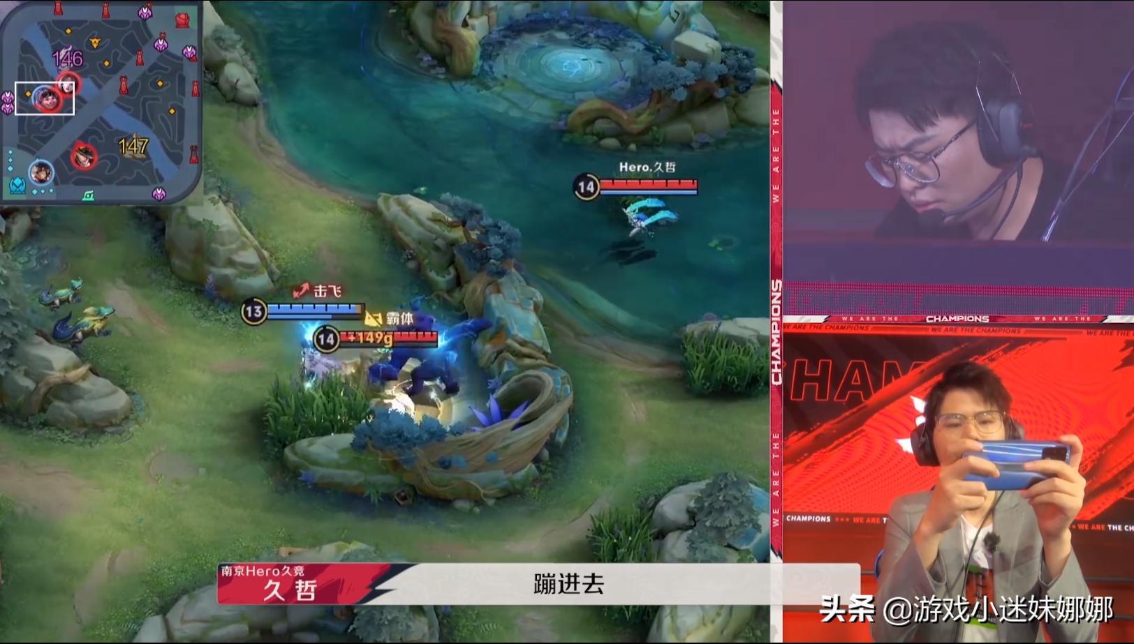 杨幂的大局观以及对于血量的判断也是可圈可点。仅有5级且半血的杨幂在观察到黄明昊的露娜从上路赶来时,便以残血自身为诱饵,hero久哲教练的貂蝉血量更多并且拥有红蓝双buff,便对扁鹊起了杀心