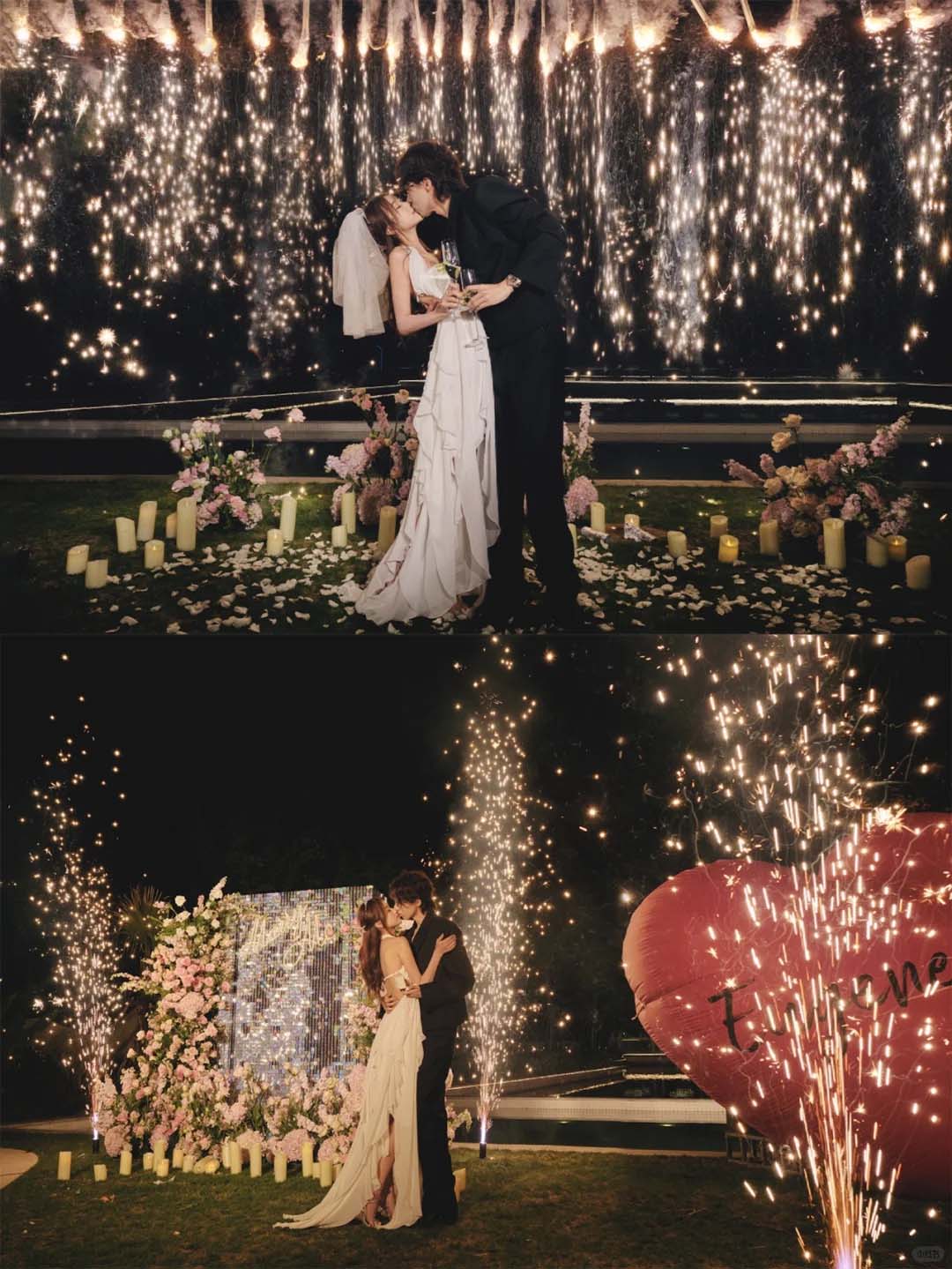 求婚时,烟花巧妙地构成了一个闪耀的心形图案,以及璀璨的“Marry Me”字样,粉色、蓝色和白色的烟花交织在一起,将周围的空气都晕染得格外温馨和梦幻。