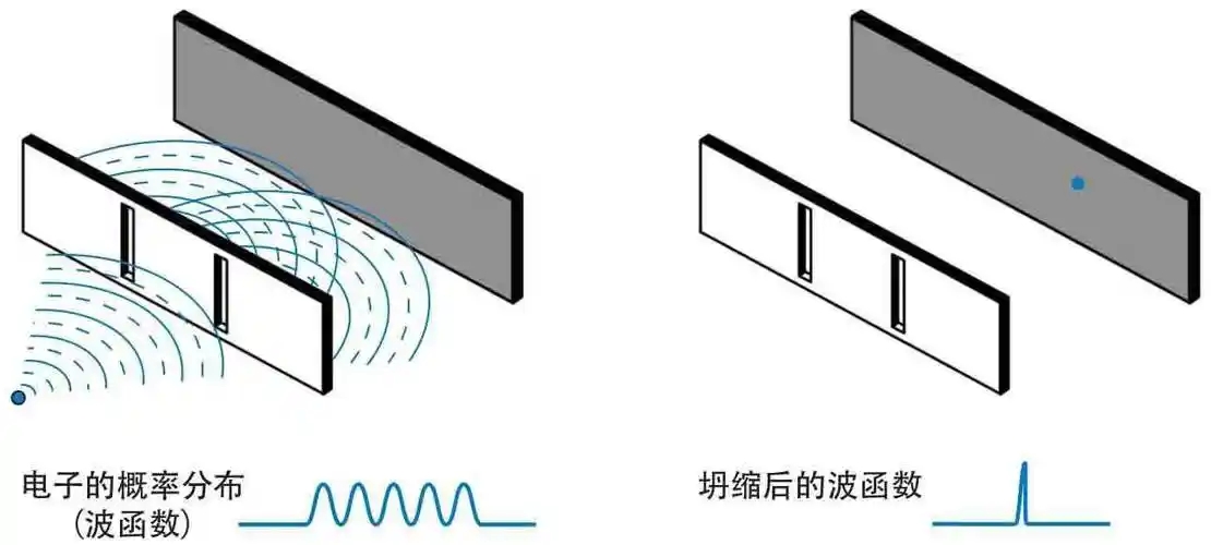 换句话说,电子在空间中『处处都在,却又处处都不在』。在电子双缝干涉实验中,当电子被发射后,它就以概率波的形式向前传播,并同时穿过了两条狭缝。在这之后,穿过狭缝后的两条概率波之间相互发生了干涉,并形成了新的概率波。当这条新的概率波遇到感光屏时,感光屏的测量行为要求电子必须出现在一个具体的位置,于是电子的概率波就坍缩了,电子根据概率波的分布随机地出现在了感光屏的某处。