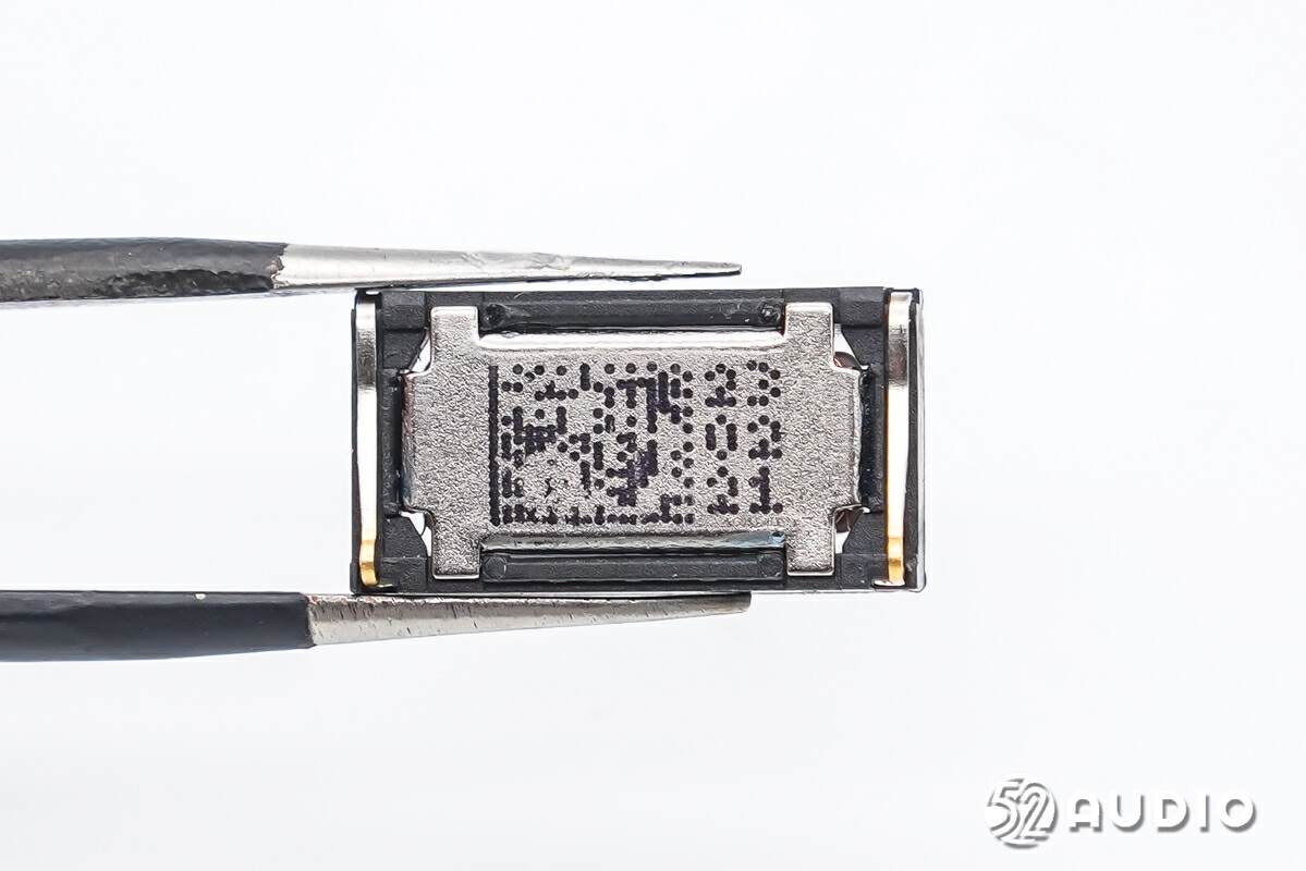 扬声器背面特写,丝印二维码,两侧通过金属触点连接金属框架。