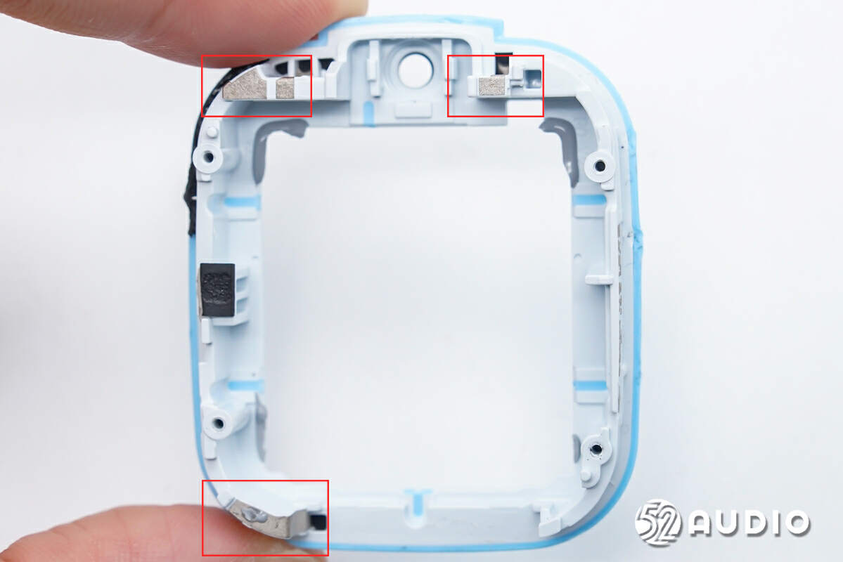 手表中框结构一览,上方印刷有三处LDS镭射天线,用于无线信号传输。