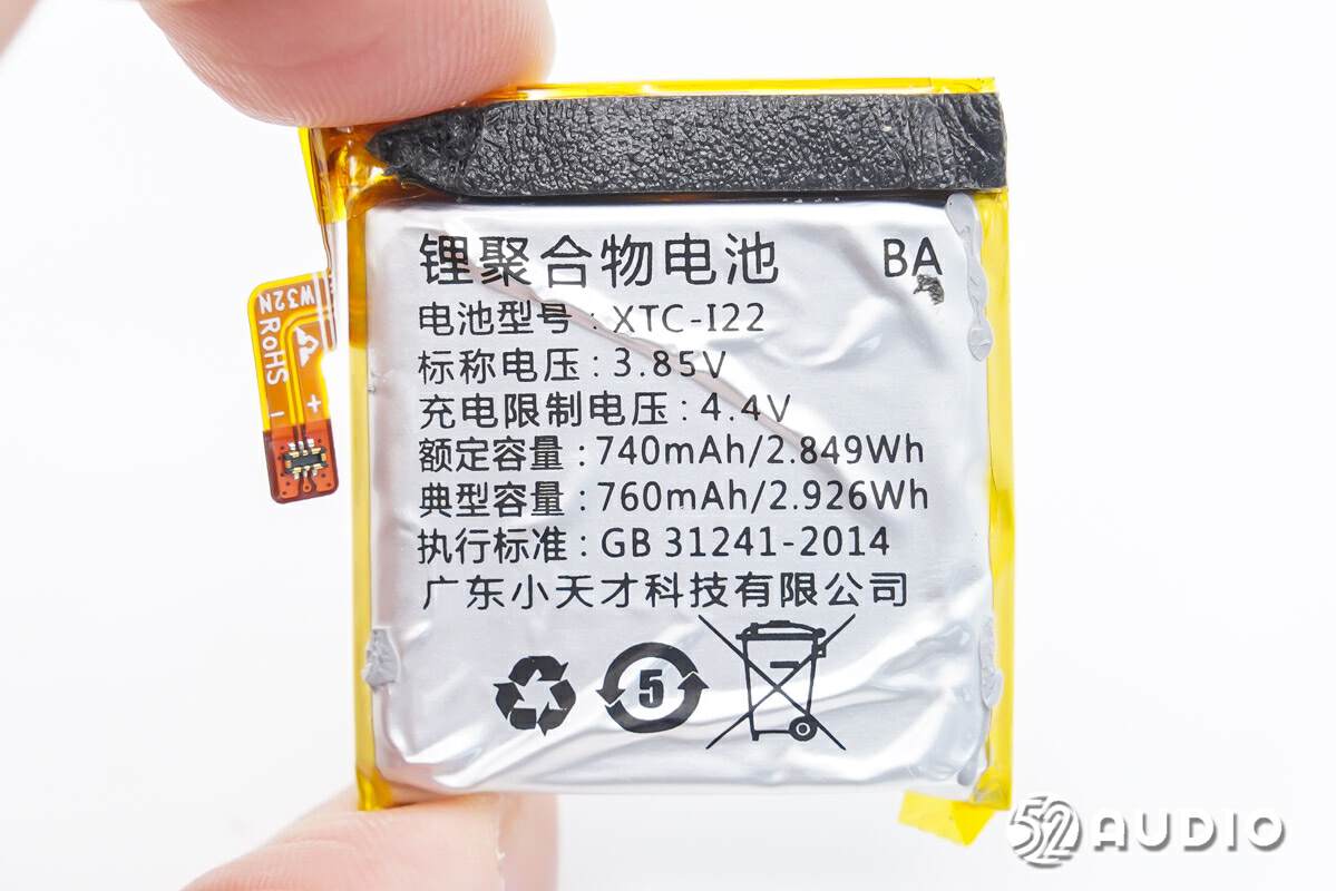 手表内置的聚合物锂电池组,型号:XTC-I22,标称电压:3.85V,充电限制电压:4.4V,额定容量:740mAh/2.849Wh,典型容量:760mAh/2.926Wh,广东小天才科技有限公司。