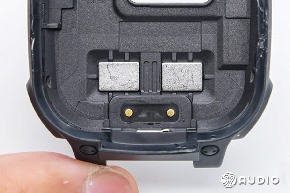 为手表充电的金属触点特写,凹槽设计,支持磁吸,提供稳定连接。