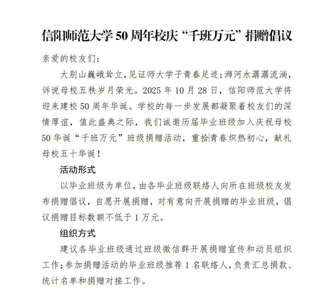 近日,信阳师范大学针对往年毕业生发起50周年校庆“千班万元”捐赠倡议。倡议书显示,10月28日,信阳师范大学将迎来建校50周年华诞。