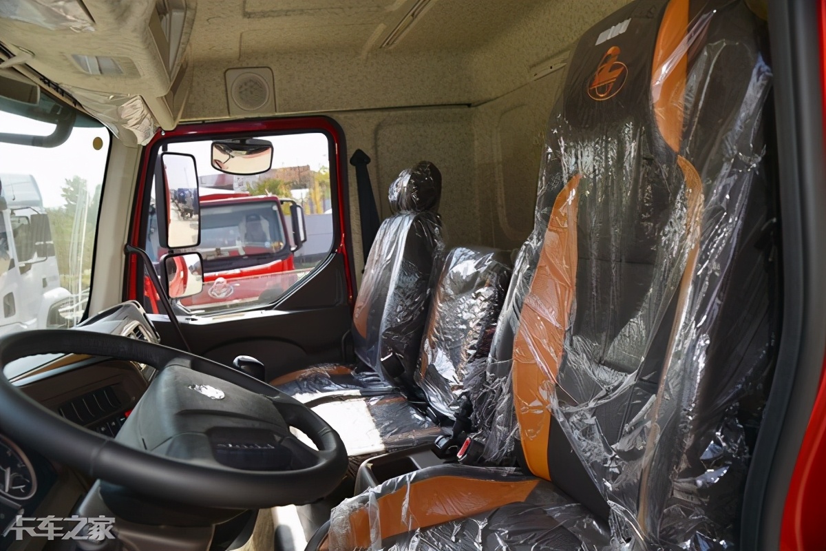 实拍车型搭载的是M31BS驾驶室,空间不是很大,但跑中短途运输足够。三个座椅均是采用皮质包裹,而且三个座椅两侧均采用橘黄色拼接条装饰,给人眼前一亮的感觉。