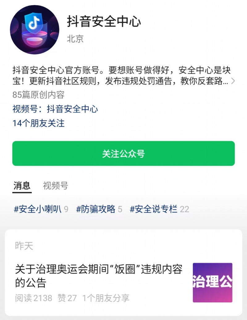 抖音安全中心公告称,奥运期间,平台累计清理涉体育饭圈化不良内容3.8万余条,对445个账号视违规情况予以阶段禁言至永久禁言处置。