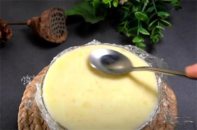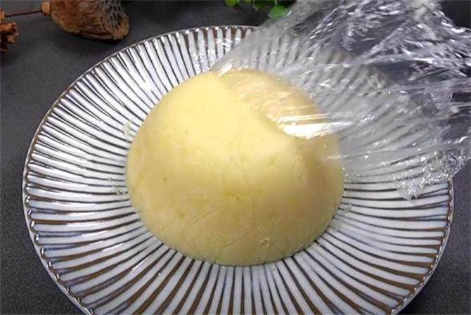 4.碗里垫上一层保鲜膜,将土豆泥装进去,用勺子压实抹平。