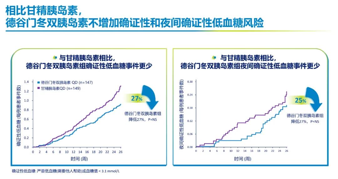 图3. 相比甘精胰岛素,德谷门冬双胰岛素不增加确证性和夜间确证性低血糖风险