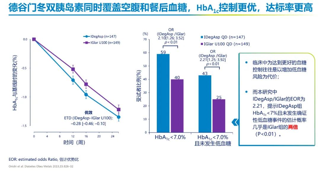 图2. Onishi研究显示德谷门冬双胰岛素同样一针起始,HbA1c控制更优,达标率更高