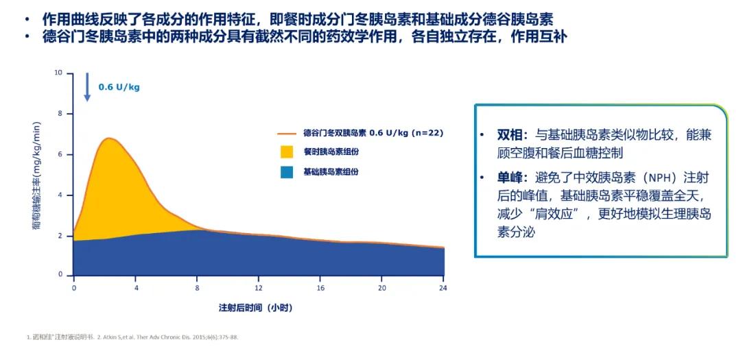 并非所有的基础胰岛素与餐时胰岛素都可以组合而成双胰岛素制剂[1-2]。长效胰岛素德谷胰岛素稳定的“T3R3”的独特构象是其与门冬胰岛素组合后仍各自独立稳定存在的基础[3]。德谷门冬双胰岛素由70%德谷胰岛素与30%门冬胰岛素组合而成[4]。研究显示在制剂中和皮下,德谷胰岛素和门冬胰岛素各自独立作用,模拟生理性胰岛素分泌,双相单峰,同时覆盖空腹和餐后血糖控制[5,6](见图1)。基础成分德谷胰岛素避免了中效胰岛素NPH注射后的峰值,血糖变异性低、平稳覆盖全天,低血糖风险小[7];门冬胰岛素组分的增加,使其能兼顾餐后血糖控制,同时起效快速,可随餐注射,更好地模拟生理胰岛素分泌[5,6]。